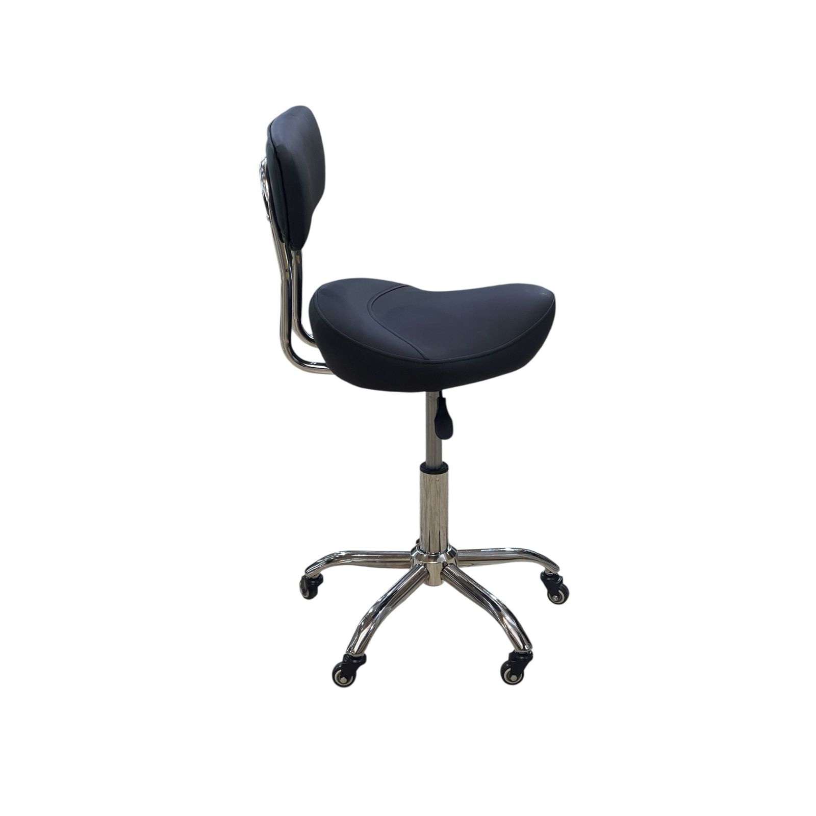 Silla negra con ruedas para una mejor movilidad y comodidad durante periodos prolongados, asiento acolchado y de material fácil de limpiar, altura ajustable, base metálica.